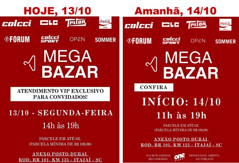 Chegou o grande dia e nesta segunda, dia 13, durante toda a tarde, a partir das 14h. vou receber alguns convidados e um time de influencers em mais uma edição do Mega Bazar Colcci, bem aquele que a gente ama! São roupas e acessórios, direto da fábrica das marcas: Forum, Triton, Sommer, Coca Cola, O...