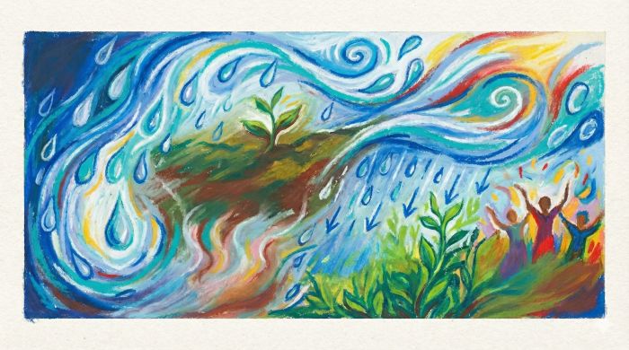 Quis falar de algo simples e essencial: a água que refresca, que liberta o calor do corpo, que não vem para destruir, mas para sustentar. Uma água que pinga, molha, mas não alaga. Que não apaga o chão — faz brotar.