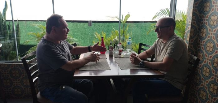 Entre uma garfada e outra, Fabinho não esconde o entusiasmo e confiança que tem no sucesso da eleição de Osmar Teixeira para deputado estadual e Paulinha para federal.