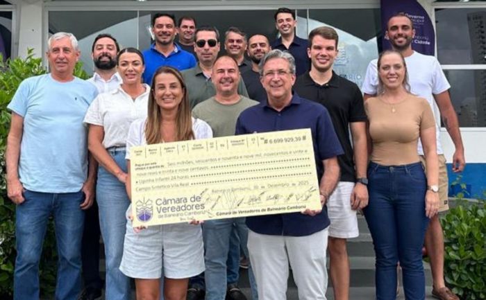 Liderados pelo presidente do Legislativo, o veterano Marco Veio Kurtz (Podemos), os parlamentares entregaram cheque simbólico com mais de 6,6 milhões de reais - recursos devolvidos para a prefeita usar em obras sociais nos bairros da city em 2026.