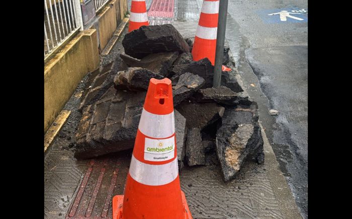 "Há três dias, uma obra do Semasa deixa a calçada da rua Lauro Müller, no centro de Itajaí, totalmente obstruída. Os pedestres são obrigados a andar pela rua, colocando suas vidas em risco".