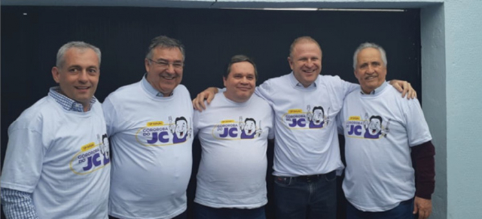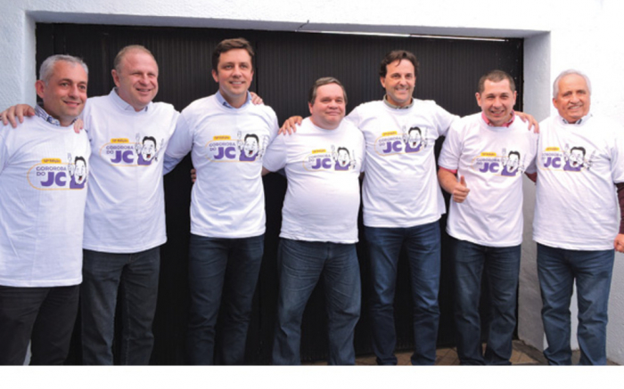 O clima na caravana é de alto astral e união neste início de campanha. Estiveram presentes os candidatos a vice-governador, João Paulo Kleinübing (DEM), a senadores, o cara de padreco Raimundo Colombo (PSD) e o turco-careca Esperidião Amin (PP), cercados de políticos de peso como Paulinho Bornhausen (PSB), o ex-homem dos galináceos, Jandir Bellini (PP), o pop star Fabrício Oliveira (PSB) e o candidato do PSB a leleia, o futebolista Nikolas Reis. Ou seja, só cachorro grande.