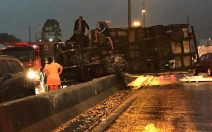 Caminhão tomba na BR-101 em frente a Avantis