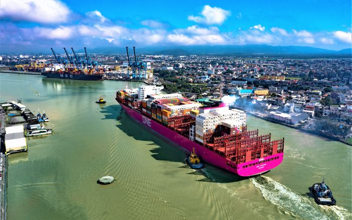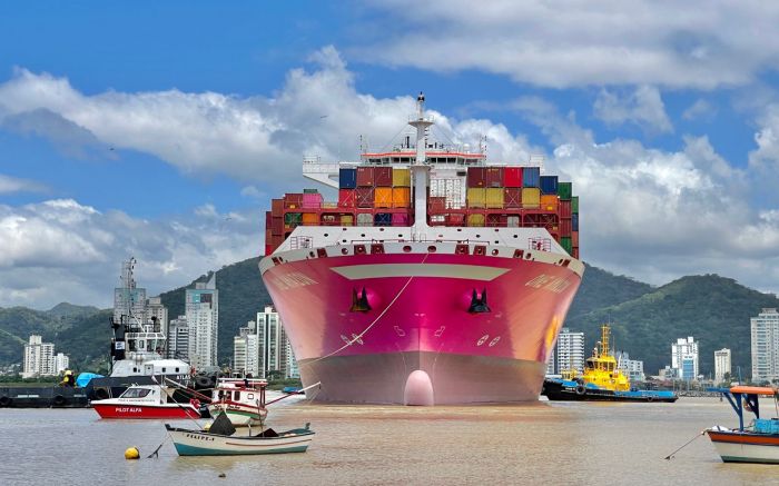 O complexo portuário de Itajaí e Navegantes recebeu no fim de semana o navio cor de rosa (ou magenta) da Ocean Network Express (ONE), o sétimo maior armador do mundo de contêineres. O cargueiro chamou a atenção pela cor em pleno Outubro Rosa e também pelo tamanho: o gigante tem 330 metros de comprimento, 48 de largura e 62 de altura.