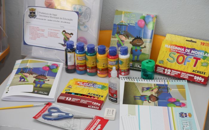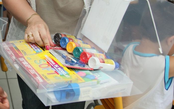 Alguns itens de uso coletivo, como massas de modelar, serão fornecidos diretamente às escolas, com o objetivo de ampliar a durabilidade dos materiais e otimizar o uso ao longo do ano.