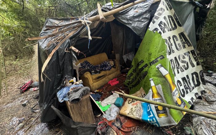 O local só foi encontrado depois de denúncias da comunidade. Lá dentro, as equipes acharam um barraco improvisado com três cômodos, sofá completo, câmera de monitoramento e até um banheiro feito com galões de água e latinhas de refrigerante.