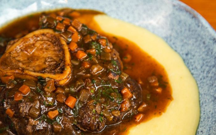 ALMOÇO E JANTAR: destaque para o "É osso", ossobuco cozido lentamente no vinho por seis horas, servido com purê de aipim cremoso e farofa crocante de milho.