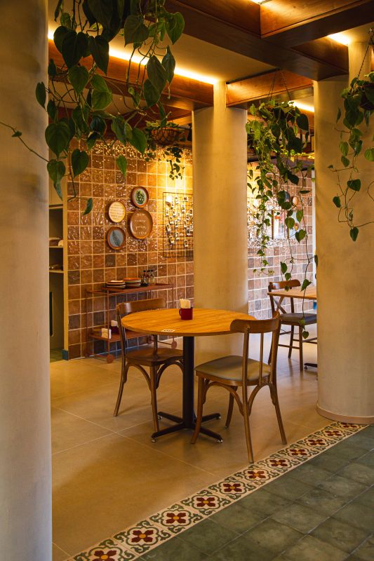 Mais do que uma cafeteria, a Madê foi pensada como uma extensão da casa da vó, da tia querida ou daquela amiga que recebe sempre de braços abertos. A ambientação traduz esse espírito: sofás macios, plantas por todos os lados, quadros, mural de fotos, ladrilhos, livros espalhados e um jardim cheio de charme.
