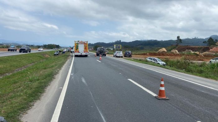 Uma batida por volta do meio-dia deste domingo deixou feridos no quilômetro 25 da BR 470, no bairro Baú Baixo, em Ilhota. Um Fiat Punto e um Toyota Yaris se chocaram, os dois saíram da pista e o Toyota capotou na vala central que divide as faixas da rodovia federal.