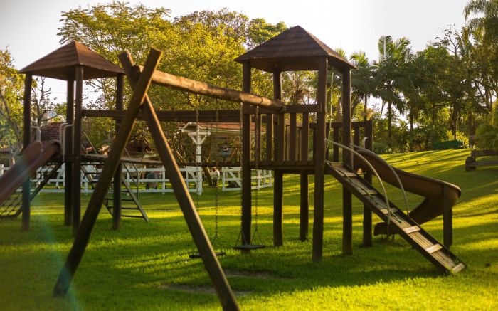 - • Brincadeiras ao ar livre em um amplo espaço verde.