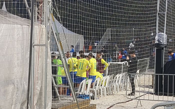 Como no futebol de areia não tem essa de empate, o jogo seguiu pra prorrogação. Mesmo com a marcação pressionando, a bola não bateu na rede para nenhum dos lados e a decisão foi para os pênaltis.