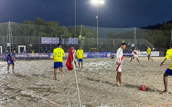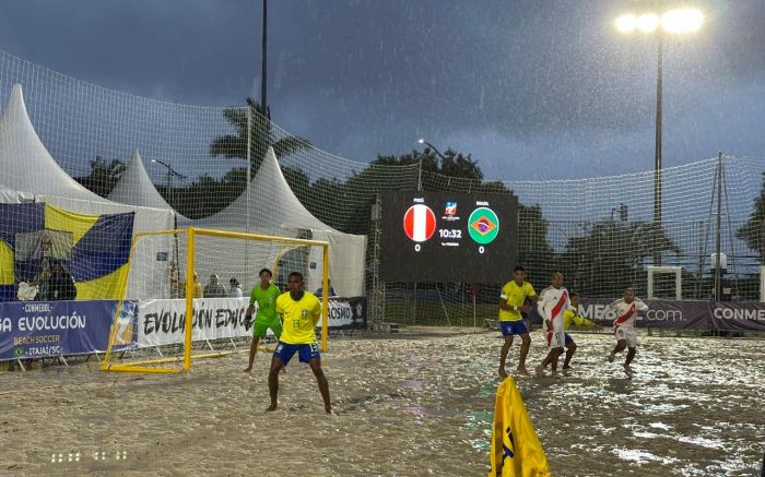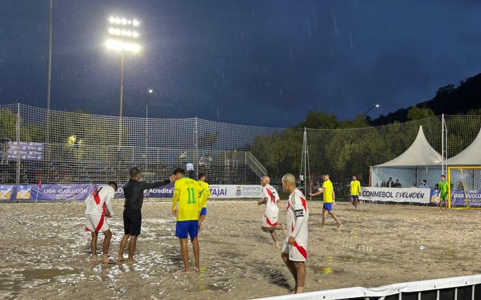 A chuva não aliviou no início da noite desta quinta-feira em Itajaí, mas mesmo assim a seleção brasileira sub-20 de futebol de areia deu um show na Arena da Beira Rio. O aguaceiro espantou a torcida, mas não desanimou os atletas do Brasil que venceram o Peru de goleada no sul-americano.