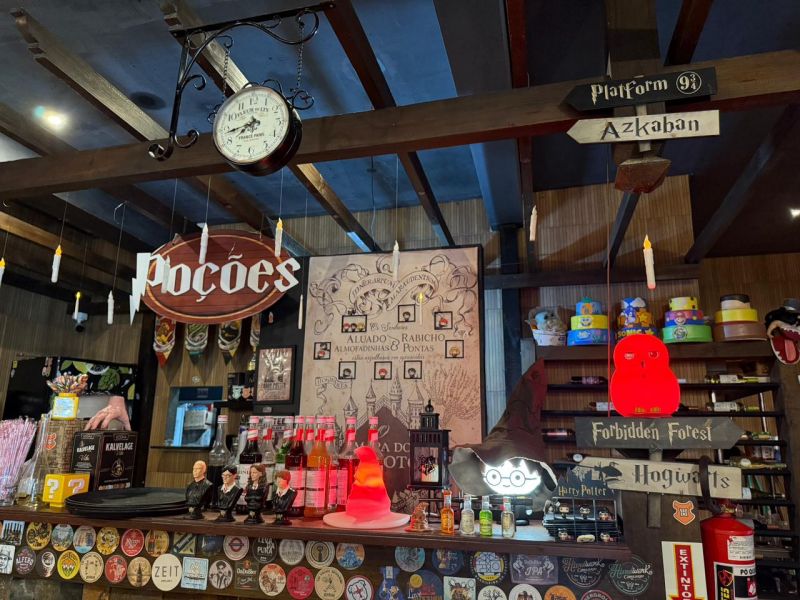 O bar temático de Harry Potter é um show à parte. Entrar ali é como atravessar a parede da plataforma 9¾. As luzes, os detalhes do cenário e os objetos icônicos criam uma atmosfera digna de Hogwarts. E os drinques? Cada um é preparado como se fosse uma aula de poções: cheios de efeitos, cores que mudam, fumaça saindo do copo e nomes que fazem qualquer fã surtar. A cada gole, uma experiência mágica e única, que desperta a sensação de estar realmente dentro do universo bruxo. Não é só beber — é viver uma cena do filme.