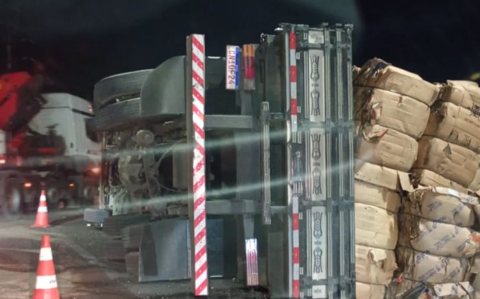 O primeiro acidente não deixou feridos. O caminhão Mercedes-Benz, com placas de Porto Alegre (RS), tombou após pender para o lado, despejando a carga no acostamento, no sentido Curitiba. O acidente foi por volta das 19h, no quilômetro 119 da rodovia. Os danos foram apenas materiais e o trânsito seguiu em meia pista até a retirada do veículo. Todos os pacotes transportados também se espalharam no acostamento. A Polícia Rodoviária Federal orientou o motorista a registrar o acidente pelo sistema eletrônico da PRF. O tipo de carga transportada não foi informado.