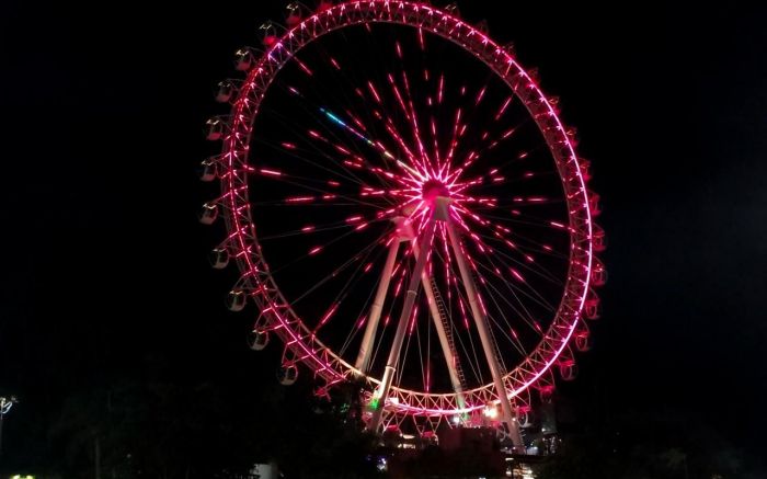 A roda-gigante também ganhou iluminação rosa para reforçar a conscientização sobre o câncer de mama