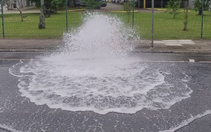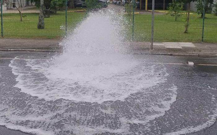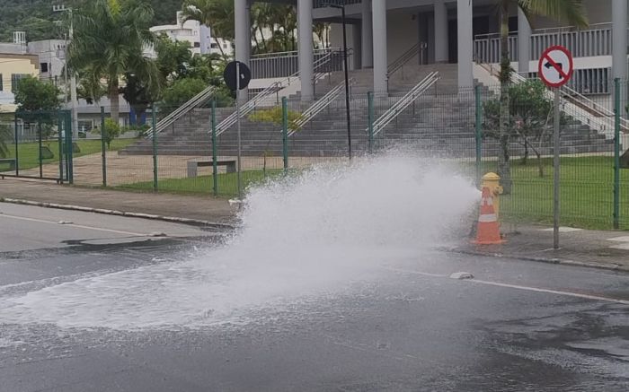Quem passou pela rua Uruguai, no centro de Itajaí, por volta das 15h45, só não tomou banho no chafariz que se formou no local porque a quarta-feira está mais pra inverno do que pra verão. A água jorrou com força do hidrante em frente ao fórum itajaiense.