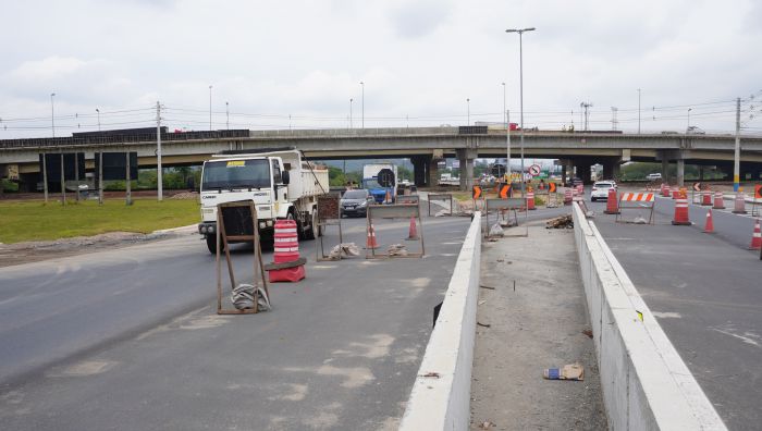 Os viadutos estão em fase final de construção. A estrutura da marginal leste da 101 passa pelos acabamentos estruturais, enquanto a da marginal oeste avança para a instalação das barreiras do tipo “New Jersey” e obras complementares.