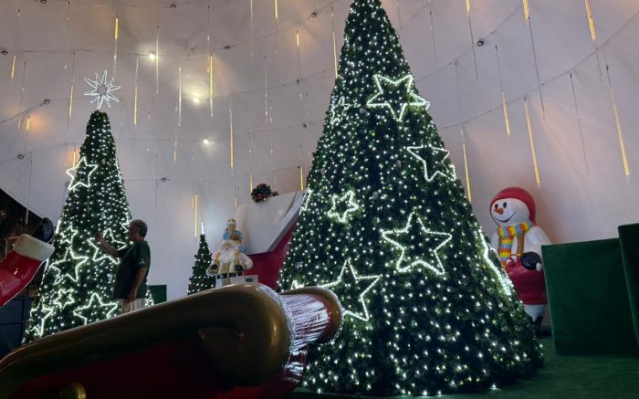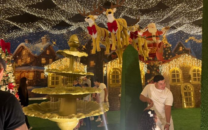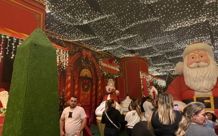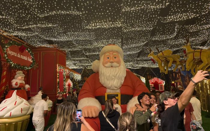 E quem pensa que Natal é só pisca-pisca e selfie no Instagram se surpreende em Itapema. A cidade montou uma tenda imersiva que parece saída daqueles parques temáticos que a gente costuma ver só na TV. Ali dentro tem casinha de cartas, Papai Noel gigante, fonte de água, estação de neve, ar-condicionado e até cheirinho de Natal. É daqueles espaços em que a criança entra sorrindo, mas o adulto é quem demora para sair.