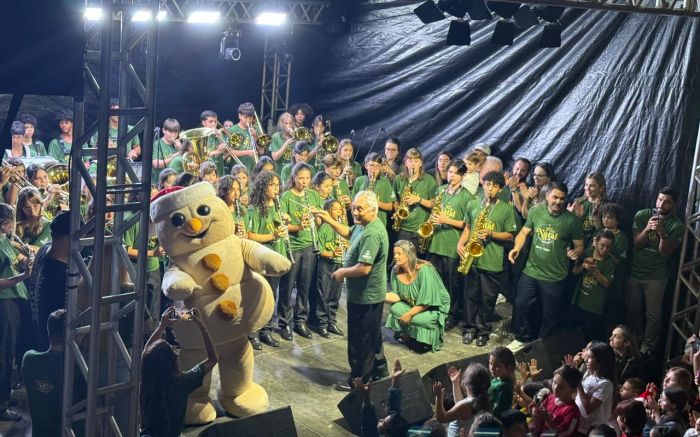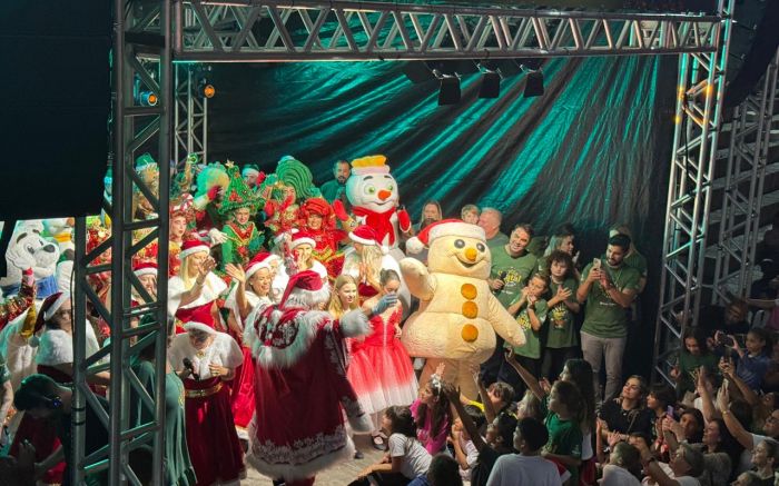 Na abertura, o Coral Vivaz puxou a noite, seguido pela banda do Papai Noel e pelo Aref, o mascote de areia que ocupa o lugar do boneco de neve por aqui. Uma sacada bem à cara do nosso litoral. A praça inteira reagiu junto: famílias espalhadas pela calçada e pela rua, gente de todas as idades entrando no clima. E as crianças? O brilho no olho deixava claro o tamanho da magia que sentiram em um espaço que não é apenas instagramável, é brincável!.