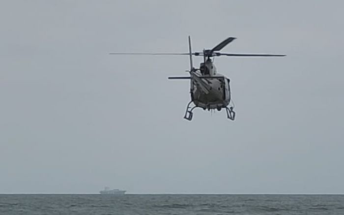 As buscas pelo desaparecido continuam com apoio de surfistas que estavam na praia e ajudaram no resgate, além de jet ski e helicóptero.