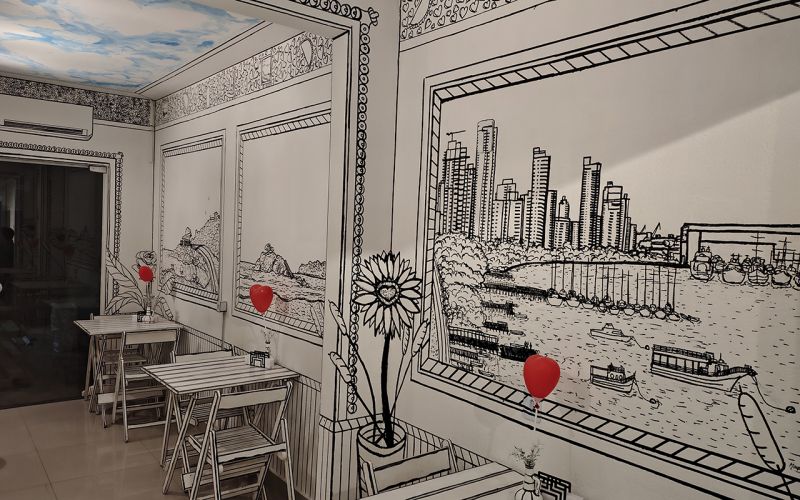 Na Fazenda, em Itajaí, a primeira pizzaria 2D de Santa Catarina é uma surpresa divertida. Criada pelo artista argentino Daniel Quinteros, o espaço parece um gibi vivo: paredes ilustradas, mesas desenhadas e detalhes que brincam com o olhar.