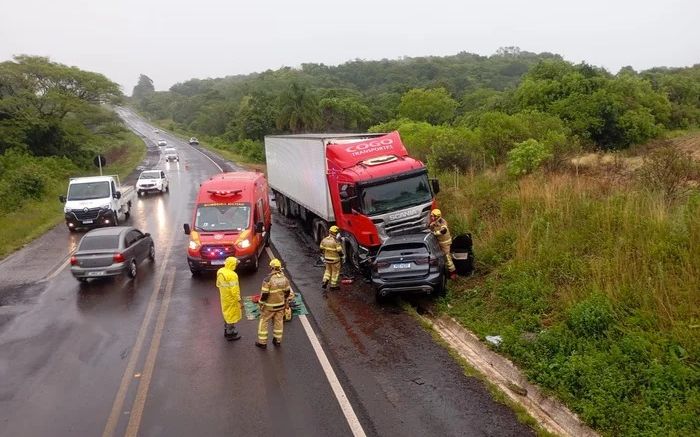 O acidente envolveu uma BMW X1, com placas de Balneário Camboriú, e um caminhão-trator Scania, de Barracão, no Paraná.