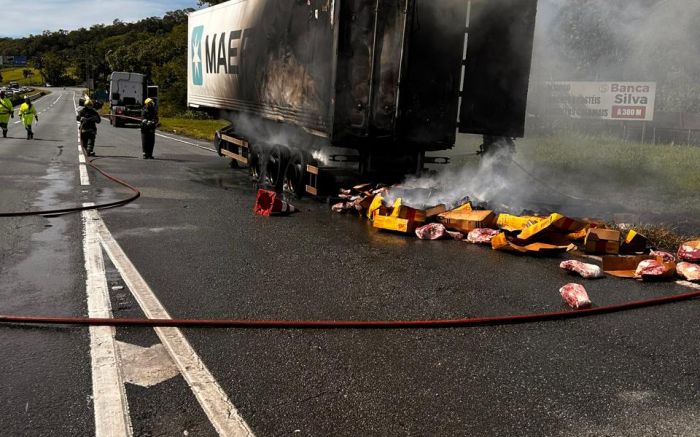 Uma carreta refrigerada, carregada com carne, pegou fogo na manhã deste domingo na BR 101, na praça de pedágio de Garuva, no norte de Santa Catarina.
