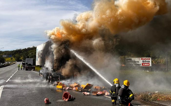 Segundo os bombeiros, o incêndio se concentrava na carroceria e nos rodados da carga, com superaquecimento das ferragens.