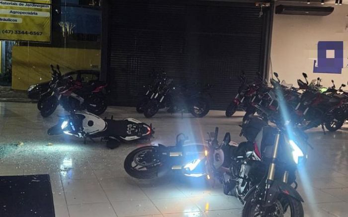 Uma quadrilha com 14 ladrões invadiu uma concessionária de motos na avenida Osvaldo Reis, em Itajaí, por volta das 2h30 desta segunda-feira. Eles detonaram a vidraça da loja. Doze motocicletas modelo Bajaj Dominar 400 foram levadas pelos criminosos. A moto é avaliada em cerca de R$ 25 mil.
