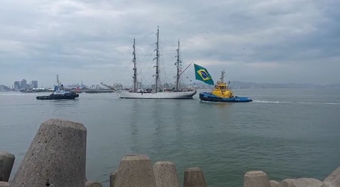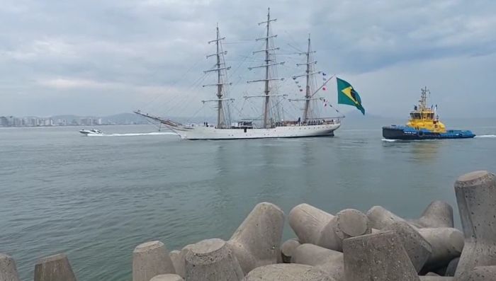 Com as velas fechadas, ele foi conduzido na entrada do canal de acesso ao rio Itajaí-açu por dois rebocadores da praticagem. “Aí, galera do DIARINHO, olha quem está chegando aqui, a caravela da Marinha do Brasil, escoltada pelos rebocadores, olha que lindo... Que orgulho de ser brasileiro. Chegando neste dia nublado em Itajaí, mas muito linda a água. O navio vai ficar aberto à visitação do público. E olha que presente para este verão de Itajaí”, narrou.