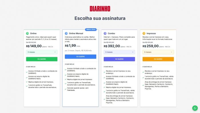A assinatura dá acesso a todo o conteúdo do DIARINHO e ao novo acervo histórico digital, além de direito a um anúncio grátis no Transe Tudo. Outras modalidades também estão com preços promocionais. A assinatura on line por período (1, 3, 6 e 12 meses), tem planos a partir de R$ 51. No combo internet + jornal impresso, o mais completo das opções, os planos partem de R$ 133.