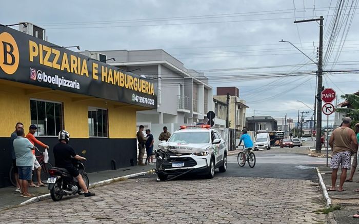 Uma viatura da Polícia Militar de Itajaí ficou danificada após bater na traseira de um Jeep Renegade na manhã desta terça-feira, no cruzamento das ruas Odílio Garcia e Francisco Olegário dos Santos, em frente à Pizzaria Boell, no bairro Cordeiros. A batida foi durante a perseguição a uma motocicleta. Apesar do susto e dos danos nos veículos, ninguém se feriu.