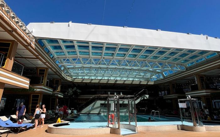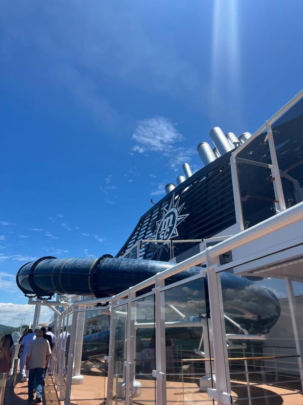 São cinco piscinas, incluindo uma com teto retrátil e outra de borda infinita na popa, com vista direta para o mar aberto. O grande astro é o Vertigo, um dos maiores toboáguas do mundo, com 120 metros e um trecho transparente que literalmente sai do navio.
