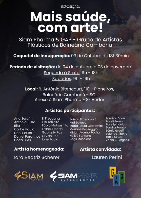A Siam Pharma e o GAP (Grupo de Artistas Plásticos de Balneário Camboriú), inaugura a Exposição “Mais Saúde com Arte” nesta quinta feira (3) no Espaço de Eventos da Siam Pharma, reunindo 31 artistas com obras variadas, que vão desde pintura a óleo, acrílica, aquarelas, esculturas e fotografia.