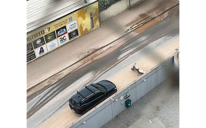 A construtora Leão Empreendimentos vem há meses trabalhando em dois terrenos na avenida Itaipava, em Itajaí. As obras acontecem uma do lado direito e outra do lado esquerdo do condomínio Ville de Leon. Eles tiram caminhões de terra de um lado e levam pro outro, passando pela frente do condomínio, deixando rastros de lama, entupindo os bueiros e valas. Quando chove a água com lama empoça dos dois lados da rua, os caminhões passam e jogam esta lama para os muros. Quando seca vira um pó sem fim.