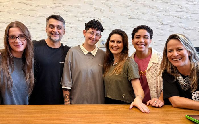 Fran (marketing), Cutelo (surf), Thay (vendas), Jô (CEO), Liriel (gerente da loja) e Fernanda (diretora), squad Santacosta BC, a nova loja da marca que inaugurou na última quinta