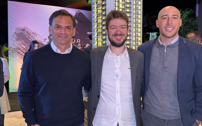 Noite de celebração - Inspirada em espaços novaiorquinos, a Aikon Empreendimentos lançou na noite de quarta-feira o MoMa Residence. Na foto, Emerson Granado, sócio-proprietário da Aikon, ladeado pelos sócios-diretores de real state da Apex, Marcelo Murad ...